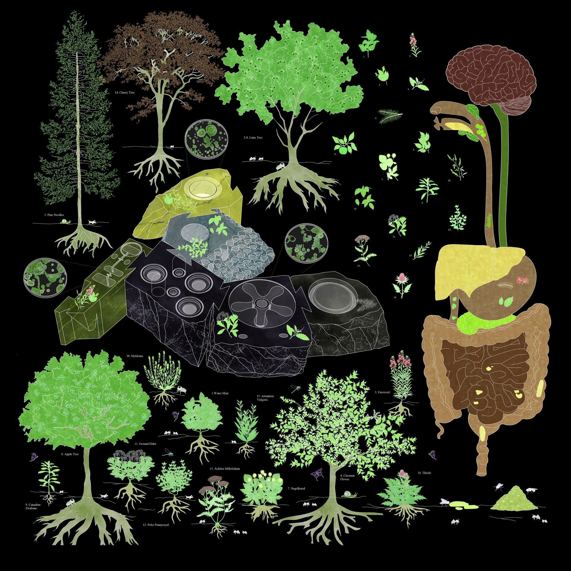 Starting in July 2024, and during the entire Summer, the Transspecies Kitchen is installed and active in the forest of the Middelheim Museum in Antwerp. The kitchen is used as the site for Antwerphagia, the act of eating and being eaten by/as Antwerp’s ecosystems. At the moment when toxicity in the soil, and climate crisis shape Flanders’ politics, the Antwerphagia is intended to provide alternative transspecies alliances based on mutual care. These alliances are humanly sensed as taste, smell, intoxication, euphoria, sleepiness, drowsiness, dyspepsia, being high, flatulence, diarrhea, heartburn, acidity, intolerance. Our kitchen is not fuelled by gas, nor by electricity. Transspecies kitchening is the art of counting energy out of molecular sociability.